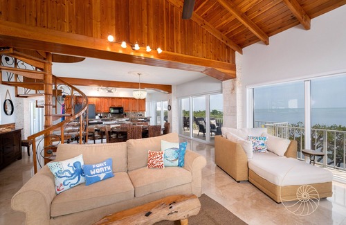 walking up the staircase you'll find the main floor To the left is a third bedroom containing two king beds and a full bath. To the right, is the kitchen, dining and living areas. Sit back, relax and soak up the picturesque views of the ocean as you enjoy breakfast at the bar or take your morning coffee out onto the spacious balcony to feel the island breeze.