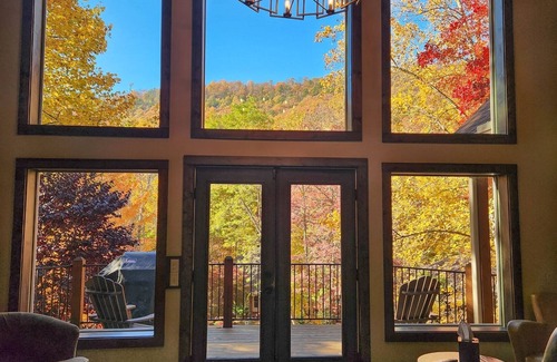 off the living room and off of each master bedroom, you'll find a large second floor deck with great views of the mountains, a sleeping bed, and a seating area inside a screened in porch with a huge stone fireplace (gas) sit outside at night with the fireplace and enjoy the sounds of the mountain!
