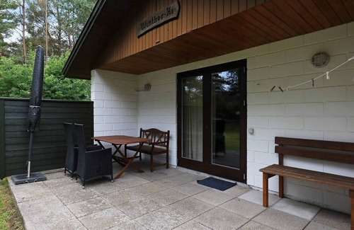 layout: open kitchen(cooker(electric), hood, coffee machine, microwave, fridge, freezer(60-99l)), living/bed room(tv(satellite, german television channels), radio, cd player, stereo unit), bedroom(2x single bed), bedroom(2x single bed), bathroom(floor heating)(bathtub or shower, washbasin, toilet), heating(electric), terrace, terrace(roofed), bbq, air to air heatpump