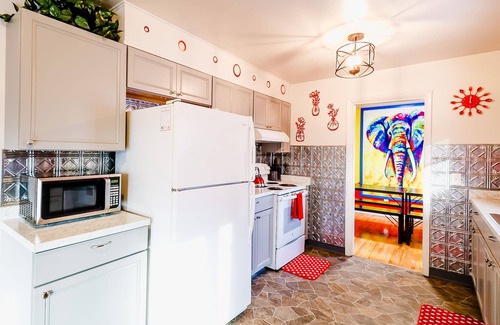 kushkations is equipped with an open kitchen layout to host guests during your stay Guests only need to provide groceries when arriving. The fridge has ample space, and an ice machine ready for drinks. Your kitchen comes fully stocked for any chef to entertain during your KushKation.