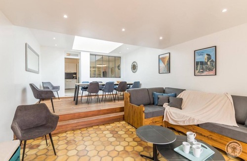 the cottage benefits from a private enclosed garden at the back, facing south, very quiet and intimate The large living room with its glass roof is the heart of the house where guests enjoy meeting at any time of the day. Spread over 3 levels, the residence is suitable for accommodating 2 to 3 families, including a toilet on each level. On the ground floor, the large walk-in shower and double sink are perfect for returning from the beach.
