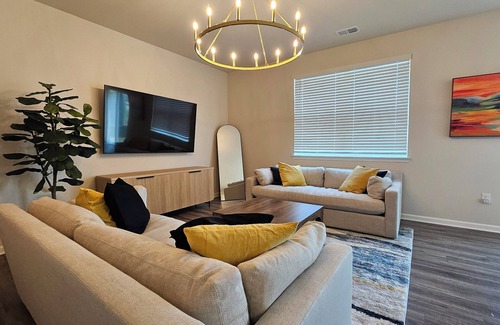 as you step inside, you're greeted by an airy, open floor plan with modern furnishings and abundant natural light The living area is ideal for relaxation, featuring plush seating and a large smart TV for entertainment. Adjacent is the fully equipped gourmet kitchen with stainless steel appliances, granite countertops, and a breakfast bar – perfect for preparing meals and gathering with loved ones.