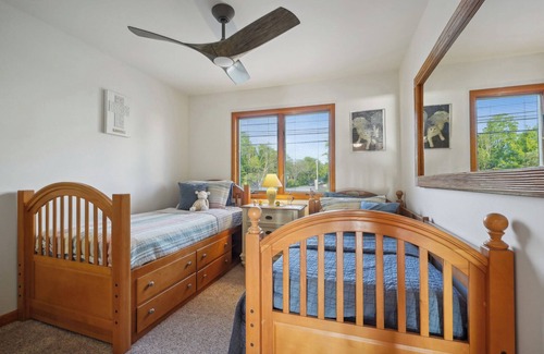 the family room is a large comfortable space with a state of the art 90" smart tv The primary ensuite is on the first floor with its own sliding door access to the outdoor patio jacuzzi and pool. Retreat to this king sized room with its own 65 " smart tv, vaulted ceilings, sitting area and bathroom with whirlpool Each bedroom has something special to offer, some with spectacular river views. tub. Whether its just you or a group its easy to relax and sun in this home with 5 bedrooms and 3 full baths that features a two story deck that overlooks a private pool, saltwater jacuzzi and river.