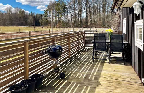 Live comfortably on a horse farm in Idehult / Påryd, where you can enjoy the view with the horses grazing beautifully in the pasture at the back of the house. Here you have a lovely terrace with a view, outdoor furniture and a barbecue where you can relax. The house has an open floor plan with large living areas. On the lower level there is a kitchen, dining area and living room with a smart TV equipped with Netflix. There are also a number of games here to brighten up your holiday. In the bathroom there is a toilet, sink, shower, as well as a washing machine and countertop dishwasher. A steep staircase takes you up to the house's two bedrooms. One bedroom with two beds, the other one with three beds and lower ceiling height. Here, too, are open floor plan without doors that divide the space between rooms. AC usage can be purchased on site by the owner of the house at a fixed weekly price. Pets are welcome. You can also enjoy the farm cattle and get in touch with the fine horses from outside the paddock if you wish. The coast with cooling baths is only 15 km away. Vita Sand is a popular bathing beach to visit, where food and ice cream are also served. If you want a bath closer, there are for example Åviken for more private swimming (1800m) and Rundtorp if you want a slightly larger swimming area. You are only 4.7 km to Påryd with the popular Lantcafét as well as shops and pizzerias. You are close to Kalmar with its large shopping and restaurant selection. Sights such as Kalmar Castle and Kalmar County Museum are usually well worth a visit. For the children, there is Skälby Gård with its lovely animals and playgrounds. A trip to the island of sun and winds, Öland, is highly recommended. Kosta Glasrike is also popular to visit, here is also Glasriket's Moose Park.