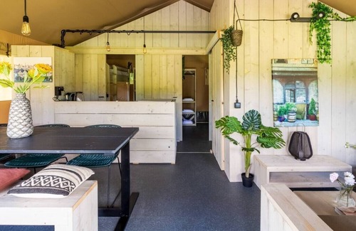 5-person safari tent lodge is located in Zeewolde. 5-person safari tent lodge provides accommodation, featuring TV, Bedding/Linens, Child Friendly, among other amenities. This Cottage features TV, Bedding/Linens, Child Friendly, to make your stay a comfortable one.