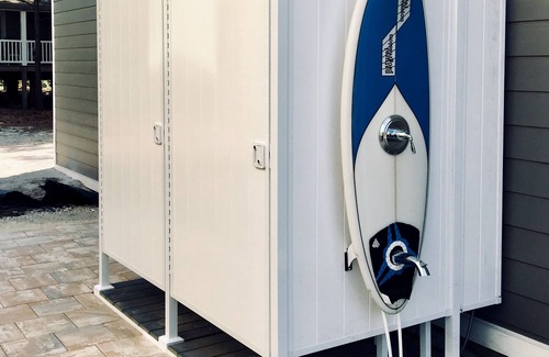 this newly built, spacious luxury beach home is only steps away from a private beach boardwalk within an oceanfront community It is beautifully designed & decorated with most generous, quality amenities. This 6,000 Sq Ft house includes 3 master suites + 5 additional guest rooms for a total of 12 beds = large enough to comfortably sleep up to 18 guests. ⭐️ Elevator reaches all 4 levels of the house.