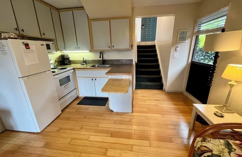 you’ll find a fully stocked kitchen, with a full-sized refrigerator and freezer, an oven with range, toaster, bbq tools, a microwave, and all the pots and pans, plates/cups/utensils, you’ll need to prepare a meal we also have a coffee maker, tea pot, and suggest having your morning beverage outside on our lanai!
