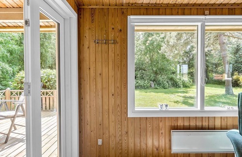 this charming holiday apartment welcomes guests with a cozy, carpeted entrance that leads directly to a well-equipped bathroom featuring a shower, wc, and sink The kitchen is a culinary delight, offering a culinary hub with a four-burner electric/gas stove, oven, extractor fan, microwave, and refrigerator with freezing capabilities, alongside a coffee machine and kettle for added convenience. The spacious living room, also carpeted, boasts comfortable seating, a television, and a charming fireplace, with direct access to a partially covered terrace. The accommodation includes two cozy bedrooms, one with a double bed and the other with four single beds (70 cm wide), ensuring restful nights. The bright dining area opens onto a wooden terrace with stunning sea views. Situated near Harbølle Harbour and its beautiful sandy beach, this apartment is perfect for exploring the scenic landscapes and the UNESCO-listed Møns Klint.