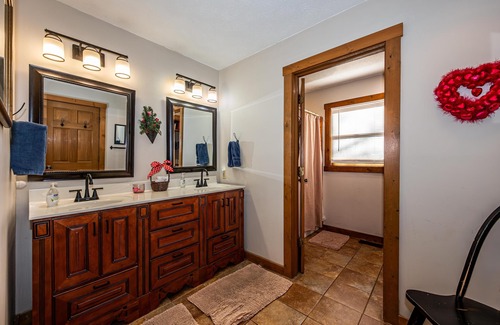 back inside, explore the master green bedroom on the main floor that features a king sized bed, walk-in closet, and 32" flat tv with youtube, prime and netflix There are also French doors out to a private corner of the porch equipped with two porch rockers. The adjoining Bath gives you the luxury of a 2 sink vanity and separate bath area. The Red Bedroom across the hall also features a king bed, ample closet, and flat screen TV with Youtube, prime and Netflix.