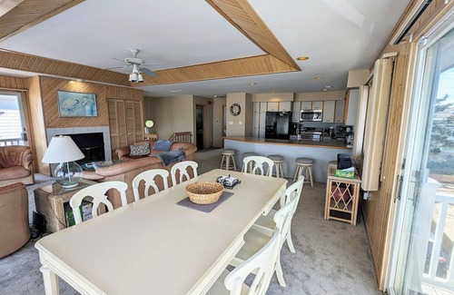 our 2500 square foot home is a comfortable, inviting, and relaxing space The combination great room/dining room/kitchen on the second floor is the focal point of the house where people spend most of their time or just outside on the balcony...when they aren't at the beach which is less than 400 feet away. The great room has a large TV and comfortable leather couch and many sliding doors to let in the breeze if you want to breathe in the fresh air for your stay. The front balcony has a partial view of the ocean over the dunes on entry to the beach and has both chairs for lounging and table for eating. The master bedroom is upstairs next to the great room and has a private balcony with a few chairs as well. The remaining bedrooms are all downstairs and the largest bedroom downstairs with the office desk workspace also has a 50" TV.
