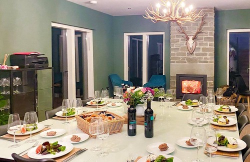 shower room: with walk-in shower and toilet. Air source heat pump heating (underfloor), gas, electricity, bed linen, towels, Wi-Fi and logs for wood burners included. Welcome pack. Garden with patio, garden furniture, barbecue and pizza oven. Wood-fired hot tub for 10 (private). Private parking for 8 cars. No smoking. Access is via a rough track. There is a natural water supply from a borehole. Please note: There are slopes, banks and sudden drops in the grounds (shared with the owner).