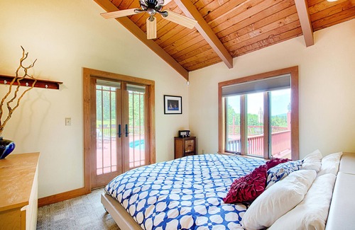 the pool, which is open during the summer, is surrounded by a large deck and offers outstanding views of the surrounding valleys and hills An outdoor gas BBQ is available for your group’s grill master. The lanai (small white building) has a fireplace and huge windows and is perfect for relaxing after a fun day of skiing, hiking, golfing, and adventure. The estate also has an outdoor firepit.