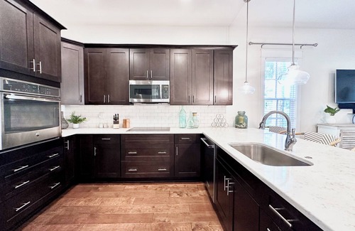 the home's open-concept living space invites relaxation and connection, with a large sectional sofa, smart tv, and coastal-inspired decor The fully equipped kitchen features granite countertops, stainless steel appliances, and everything you need to prepare meals during your stay. Dine together at the spacious table or grab a casual bite at the breakfast bar. Step outside to the private screened-in patio, a peaceful spot for morning coffee or evening cocktails. A convenient half bath is also located on the first floor.