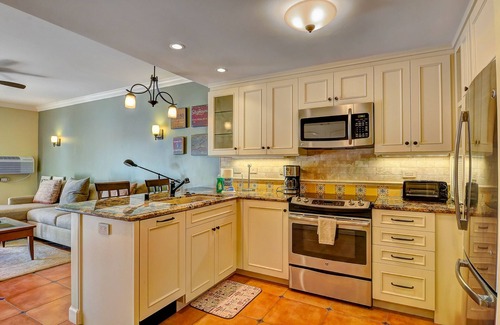 the fully stocked kitchen is the perfect place to create a culinary delight of your own There are all new, stainless steel appliances that include a full-size refrigerator, an electric stove/oven, a microwave, and a dishwasher. If you need a break from cooking, then there is no need to drive. Just take a short stroll to Bar Traza or Bob's Steak House on the resort.