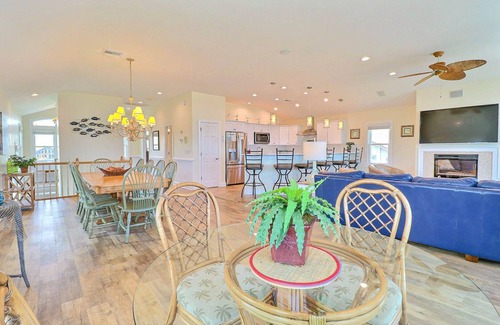 the top-level boasts a great spacious room with vaulted ceilings and stunning ocean views Enjoy the panoramic site of the Atlantic Ocean from the decks or view the seascape from the comfort of the great room. Gather together in the thoughtfully decorated living area with plenty of seating for everyone. Catch up on your favorite shows or blockbuster movie on the large Flat Screen TV, and enjoy the flickering embers in the Dimplex Cool Ice Electric Fireplace (for all-season use). Prepare meals in the well-appointed modern kitchen with stainless steel appliances, quartz countertops, tile backsplash, two sinks, 50 lb ice machine, and a wraparound breakfast bar. Seating for 14 is provided in the dining area with dining tables. Step outside to the back deck and dine al fresco at the 2 picnic tables under the stars. The well-furnished deck offers plenty of seating for ocean gazing. When it's time to retire for the evening, rest easy in the final bedroom this home offers, a king master bedroom w/ its own private bathroom that includes a shower and garden tub.
