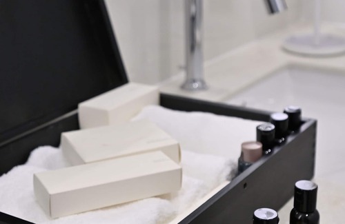 while you're here, you can enjoy all the comforts of home and more, including wifi and a bidet, as well as air conditioning and an ironing board Other amenities include towels, soap, toilet paper, and a hair dryer.