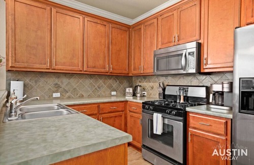 when hunger strikes, our sleek, fully-equipped kitchen answers the call With top-tier appliances, including a handy dishwasher, and chic bar seating for four, it`s the ideal space for everything from morning coffees to dinner parties. If outdoor relaxation is your vibe, step out into our sunlit sanctuary, a tranquil setting for soaking up the Austin atmosphere.