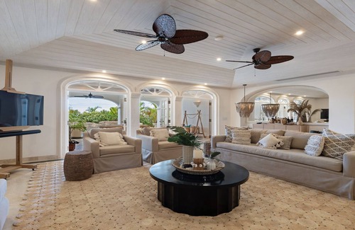 This is a luxurious, ground-floor three-bedroom beachfront apartment located on the stunning West Coast of Barbados. This beautiful unit boasts a private entrance, high vaulted ceilings, and a warm, cohesive design that effortlessly blends coastal, organic, boho elements with the natural beauty of its surroundings. The soothing aquamarine waters of the Caribbean perfectly complement the interior's earthy tones of beige and brown, creating a serene and inviting atmosphere throughout.