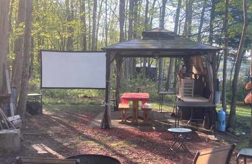 cabin sleeps five, with a queen bed in the master bedroom on main floor, a double log bed and a queen bed in the loft, as well as a twin rollaway in walk in closet The bathroom is off the spacious den. There is an air conditioner in the master bedroom. Normally the cabin stays quite cool by following a few easy tips. Please help yourselves to the well stocked kitchen and linens. A brand new gas stove is in kitchen. Large TV in the den with lots of movies to watch. Two twelve by twelve foot Canopies right on the water with a stocked fire pit and hammocks nearby. Electricity, WIFI, refrigerator and rain barrel all conveniently located. Large outdoor screen with Bluetooth speaker for viewing movies or concerts also down by the water. New, a private screened gazebo right on the water with a gas firepit 100 ft from the main area (where the tent used to be)..