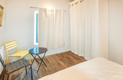 bright colors and wooden beams emphasize the decorative and homey ambience throughout the level With enough space for up to 6 people, the accommodation includes open-plan living and an enclosed garden with a shared outdoor pool. You can also look forward to a beautiful view of the rural and hilly surroundings with the foothills of the Monts du Vercors in the background.