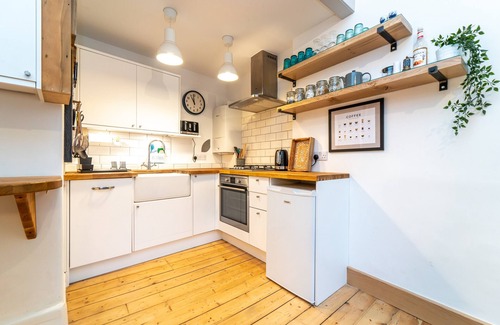 when it’s time to catch some rest, head to the dreamy double bedroom, featuring funky lighting and a handmade wooden bed A good night’s rest is assured as the bedroom overlooks the quiet garden. A contemporary, slick bathroom with an over-bath shower, heated towel rail and trendy decoration completes this fantastic holiday home.