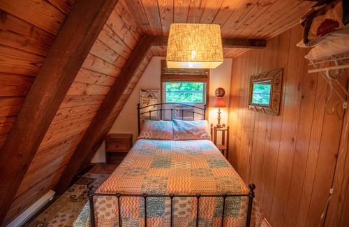 size doesn't matter when you have your own garden spot directly on the new river A Frame of Mind is a traditional A-frame cabin with a beamed vaulted living room, providing the cozy cabin atmosphere you've been dreaming of. The open floor plan on the main level includes a living room with TV, a small but well-equipped kitchen, a bedroom with a full bed and a full bath. For additional sleeping accommodations, take the spiral staircase to the loft, where you'll find two twin beds.