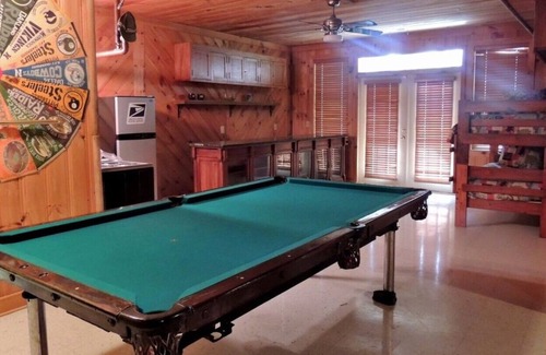 the lower level of this home has a second fully furnished living area, with a wood-burning fireplace (duraflame logs only), a pool table, a mini kitchen, and sleeping area with bunkbeds, and room for a queen air mattress for extra sleeping capacity It also has an old-fashioned soda fountain which can be used for food service, a bar, an ice cream party, pizza party, etc. There are two sets of French doors that lead out onto a covered patio. The patio has chase lounges on it and a picnic table for outside dining with a gas grill and a hot tub for your relaxation. A fire pit for s’mores and just enjoying together. There is a small table and chairs on the front porch.