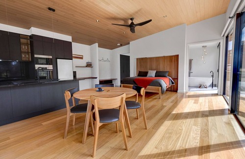 Welcome to this stunning holiday retreat – a modern and exquisitely decorated studio perched atop the serene shoreline, offering picturesque views of the Picnic Bay. Nestled within a charming family farm that thrives with sheep and bustling rural business, this idyllic escape promises a blend of contemporary comfort and rustic charm.