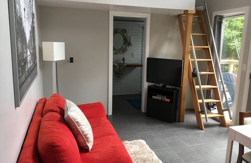This brand new tiny house at the top of our hill features an open floor plan, Southern orientation, is passive solar, and located just 4 miles from quaint downtown Marshall or 20-25 minutes from both Asheville and Hot Springs. There are tons of outdoor adventures to be had nearby including horseback riding, rafting/paddling the river, zip-lining, and hiking. Enjoy a peaceful stay in this secluded modern home surrounded by greenery, with every contemporary amenity and tons of natural beauty!.