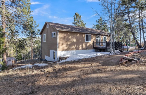 Discover this private retreat 5-bedroom gem in Divide. This lovely house offers a peaceful retreat for guests to connect with nature and enjoy what mountain life has to offer. Surrounded by aspen and evergreen trees on 4 acres. The home has 2 king beds, 2 bunk beds (twin and full, and twin/twin), and 1 queen bed, there's plenty of space for everyone to unwind. The upstairs living room offers a wood burning fireplace and a direct view of Pikes peak for the cozy mountain experience you are looking for. The cozy downstairs living room, complete with a twin day bed, provides an additional space to relax also has a wood burning fireplace. Enjoy a large dining table for the entire family to play games and enjoy home cooked meals from the fulling equipped kitchen. Embrace the outdoors with our fire pit with seating for everyone, hammocks among the privacy of the property, and of course the hot tub to relax under the starlight. Immerse yourself in the tranquility of this wonderful property. We look forward to hosting you at our place.