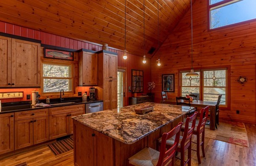 on the south side of the great room is the dining area with comfortable seating for 4 and mountain views through the windows Adjacent to the dining area is the fully-equipped kitchen featuring a large island topped with Delicatus Gold Granite with seating for three, stainless steel appliances, soft-closing cabinets and drawers, Noritake Stoneware, a KitchenAid mixer, and high quality silverware, knives, and cookware.