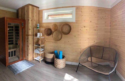 unwind in a hot tub surrounded by trees, cozy up with a book in the library, enjoy the sauna, and stretch out in your own private yoga studio.