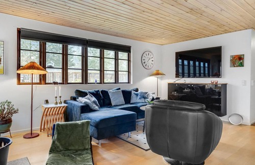 the authentic wooden house is ideal for one or two families with pets who want to spend a relaxing vacation together in djursland You step into a cozy and welcoming vacation home. Here you can make yourself comfortable with a warming fireplace or a glass of wine in the living room. Thanks to the many windows, an incredible amount of light enters the room, which adds to the natural flair. On the open and partially covered terrace with garden furniture and barbecue, it is wonderful to spend a barbecue evening or a delicious breakfast.