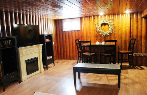 we have 2 living areas The upstairs living room has plenty of space for gathering, and a sofa sleeper. The downstairs den has a Roku TV and DVD player, DVDs, board games, wrap-around seating and a couch.
