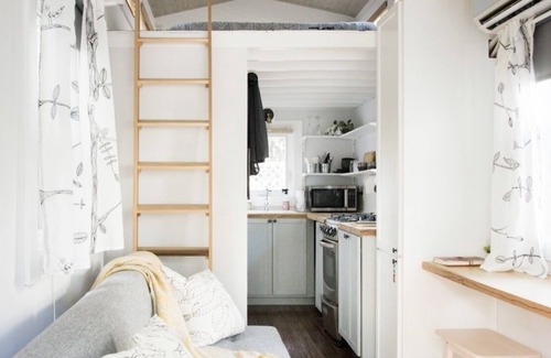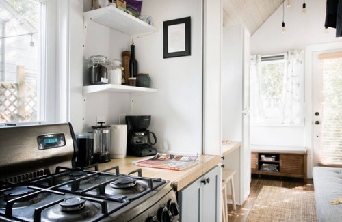 it s tiny! but it doesn t feel that way The light color of the bamboo flooring, the many windows and the high ceilings help to open it up. The loft holds a queen-sized mattress, which sits low to the floor on tatami mats. There is a full bath with a rain-down shower, air vent, and cloth curtain door. There is a fully functional kitchen, with gas stove and microwave. There is a desk/table and a very comfy futon couch that opens to sleep an (additional) adult or two children (who are very welcome). The futon, when pulled out, measures 82” x 45.”