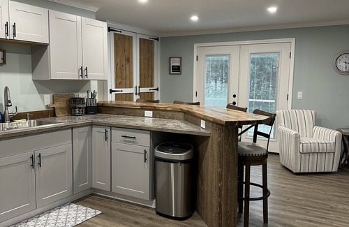 located behind the red barn awaits this brand new 1bed | 1bath apartment suite Recently been renovated to perfection with beautiful details begin once you arrive. A custom floor-to-ceiling glass garage door greets you as you arrive with a private entrance to the left. Step inside to a custom barn-board mudroom, leading upstairs to the main living area with a look-out balcony over the yard.