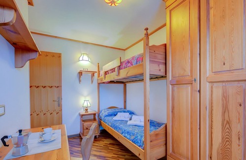 Three-room apartment sleeping 4+2, ideal for families with children or groups of friends. The rooms are furnished with alpine-style solid wood furniture and warm parquet floors. The apartment has an independent entrance and consists of a large living room with dining area for 6 people, living room with flat screen TV, wifi, two sofas, one of which converts into a double bed, kitchenette with 4-zone electric hob, electric oven , fridge and complete kitchen equipment for 6 people, hallway to access the sleeping area and bathroom, double bedroom with wardrobe and wall safe, bedroom with two bunk beds, wardrobe and writing table, bathroom with tub.