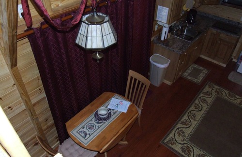 our autumn breeze cabin is tastefully done with one queen bed and a single bed loft It has beautiful wood floors and all knotty pine walls and ceilings. It has a large back porch with breakfast bar that overlooks a small ravine. It has all the necessary amenities including an outdoor fire pit and park grill - we provide the firewood. We accept pets with a $50 fee for up to two pets per visit plus tax. Additional pet is $25 per pet if approved..