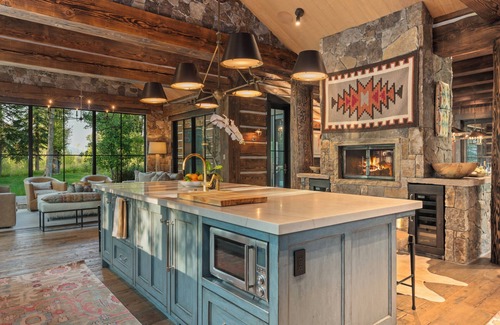 the main house features four king bedrooms and one 2 queen bedroom each with ensuite bathrooms and outdoor access with luxurious touches, while three historic cabins provide added comfort, privacy, and unique character Rare for Jackson Hole, the property's four dwellings were grandfathered in under Teton County guidelines, giving it the feel of a mini ranch rather than just a single home.