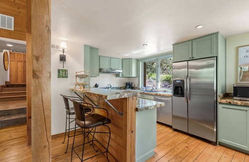 Located 2 miles above the Sundance Resort, Above It All is a favorite mountain cabin perfect for a getaway any season of the year. The cabin has a wonderful back deck and lawn that leads to the a ravine where you will enjoy the sounds of the stream year round. The rustic interior and french doors offer warm natural light, a wood burning stone fireplace, and beautiful decor. And best of all, enjoy the forested views and the soothing sound of the stream from the deck.