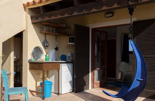Very charming studio with private terrace in an original very scenic, romantic finca or rural house in Ibicenco style in the Mid-East of Ibiza, close to several small (nude) beaches and idyllic small bays and Cala Martina. Local regulations ask us to rent via VRBO from 40 days and up only. Escape; It's allowed (fb) friends stay with us for short time. So friends could send me, KC Godrie, Ibiza, a direct message, via social media, via my family name plus eu or also via airbnob dot com. Don't forget the o because we rent out our accommodation only without breakfast. The house is close to the sea in a very quiet area next door to the famous hippy market of Es Canar and next door Camping La Playa.