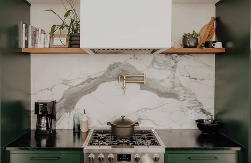 the space is elegantly furnished with a wooden dining table and matching chairs, plush seating around a stylish black and white swirl marble coffee table facing a cozy woodstove The forest green and black kitchen contrasts beautifully against the crisp white background boasting graceful pendant light fixtures, marble countertops and an artistic backsplash that adds a unique touch of character.