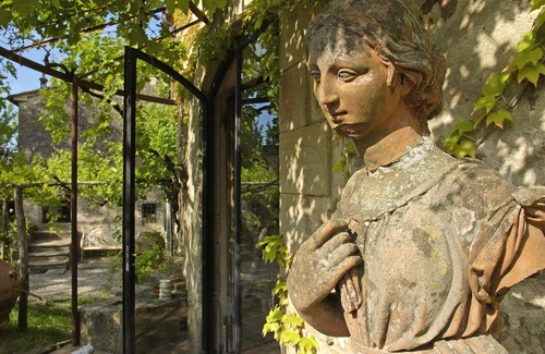 Panoramic apartment for four on the first floor, with independent entrance, furnished terrace with 360 ° view over the woods, the park pond and the valley of centenary olive trees; about 65 sq m (700 sq ft), it is located inside the historic Pieve di Caminino private estate; shares with six other apartments the large park and the swimming pool: the private estate covers over 200 hectares, mostly fenced for maximum privacy, with olive grove, vineyard and cork forest where you can walk or jog for kilometers in absolute tranquility , in the midst of the unspoiled nature of a historic estate, once a monastery, today an organic farm. The apartment has a furnished entrance which leads to both the apartment and the terrace. The living room with kitchenette has a large arched window with a splendid view, and a second window facing the woods; the dining area, furnished with a table and four chairs, is set against the panoramic arch; the living area has a sofa with a reading table in front of a fireplace; the kitchenette has two electric hobs, small oven, antique marble sink, 130-liter refrigerator, all utensils and dishes for four people, water boiler, coffee pod machine. The entrance leads to the two bedrooms, one with a "queen size" double bed, with ceiling fan and window shielded by anti-mosquito nets overlooking the valley, and the other with two single beds, floor fan and window with a view, always shielded from anti-mosquito nets. The bathroom has a large shower cubicle, w. c. and sink. The outdoor terrace, furnished with table and chairs, if desired with umbrella, allows you to have lunch and dinner outdoors comfortably for 4 people. The restyling and furnishings have been personally supervised by the owners, architects, using paintings and furniture from the family collections. It is equipped with wifi internet, included in the price, while by choice in the name of the countryside and tranquility the TV was not installed. Instead, a radio with classical music CDs is installed and a library is available, centered on Tuscany and its itineraries, flavors and wines. Guests are received by the owners, who live on the estate and are available for any need or information. Guests are welcomed in the hall of the ancient former parish church, now a permanent museum, the visit of which is reserved exclusively - on request - to guests booked during their stay.