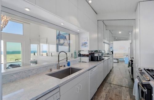 Imagine endless views of sand and glistening ocean through expansive windows, looking out upon the quietest, most peaceful stretch of Silver Strand beach. Take in the sailboats, dolphins, pelicans, and waves! Your main living area- kitchen and den with fireplace are on the second floor with high ceilings that seem to escalate your enjoyment of the view. Mirrors everywhere reflect the light of the beach. Two massive sliders open up to deck with large seating area, fire-table, and a hot tub that seems made for soaking up sunsets. Upstairs there is a Master bedroom with king bed and a Master bathroom with awesome jetted shower. The kid's room is whimsically adorned with two full-size beds that form a giant pirate ship with two underlying trundle-twin beds. Kid's bathroom includes combo shower/ tub. Downstairs there is a guest bedroom with king bed and full bathroom. The downstairs den overlooks the beach and includes a television, fireplace and kitchenette/ bar area. The garage has been converted to playroom with pool table, television, and queen sized murphy bed as well as futon couch. There is also a second full bathroom and laundry room downstairs. Downstairs beachfront deck has BBQ and outdoor shower. Driveway has ample parking (a gem as street parking is scarce in this part of Silver Strand). You'll have access to games, chairs, umbrellas, toys, etc... everything you might need to enjoy your dream beach escape!