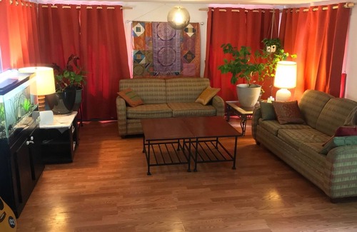 one other rented room to quiet long term guest Shared Commons include kitchen, dining, office, library, den/office, full bath with shower, cloakroom, basement with laundry and outdoor space to enjoy garden or other homestead activities in a forested setting, frequented by wildlife including moose..