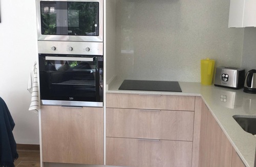 the kitchen is a fully equipped quartz-topped kitchen that includes a dishwasher, refrigerator/freezer, microwave, toaster, kettle, coffee-maker, orange/lemon juice, and a smoothie maker