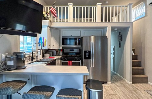 welcome to your perfect riverfront vacation rental on the parker strip! ice cold ac! this patriotic theme, tiny house is the perfect getaway for a family or small group of friends who are looking to relax and have some fun in the sun The house features a comfortable queen bedroom, a bathroom, a fully equipped kitchen, and a cozy living area where you can kick back and relax. The upstairs loft has two additional queen beds. Adjacent to the tiny house is a beautiful casita, featuring a queen bed, bathroom, and mini kitchen.