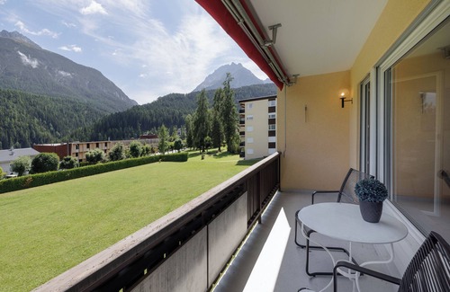 cozy, child-friendly, stylish 25-room apartment, approx. 60 m² living space, comfortably furnished, very quiet location yet easily accessible. Sunny balcony with magnificent views of the Lower Engadine mountains and the large playground.