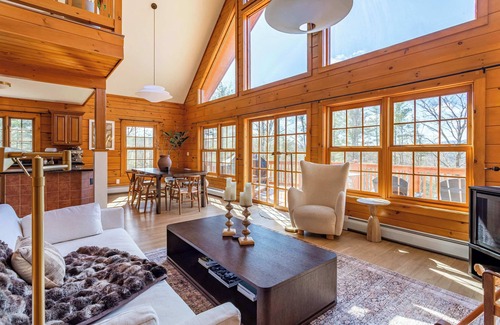 alpine view is a charming two story 4 bed, 3 bath chalet 3 hours away from nyc This home features gorgeous mountain views through expansive floor to ceiling windows complemented by high vaulted ceilings, warm natural wood finishes throughout and a wraparound deck with grill and outdoor seating. The property also boasts a sauna, gas fireplace, firepit, pool table and laptop friendly workspace.