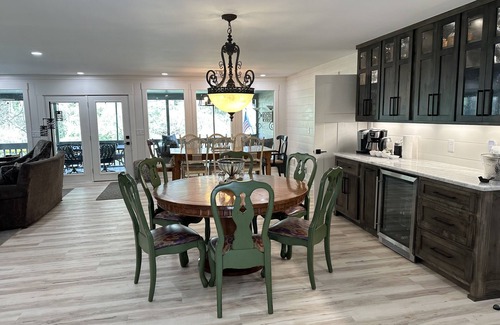 if you are a "master chef", "sous chef" or "personal family chef," you will be extremely pleased with this very well stocked, well planned and extra large kitchen and bar with dining seating for 14+ guests and open entertainment area with up close views of the river